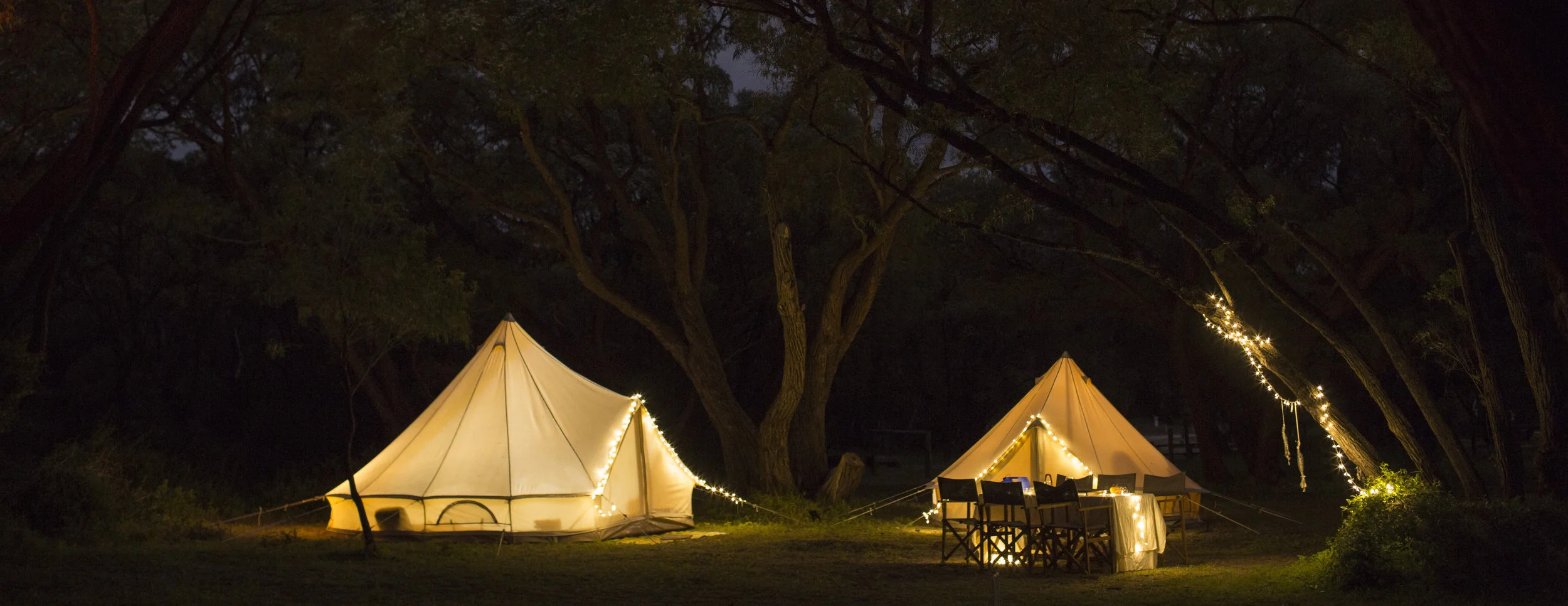 WE FURNISH OUR TENTS WITH QUEEN-SIZE MATTRESSES AND/OR SINGLE MATTRESSES, PILLOWS, DUVETS AND FRESH WHITE LINEN, TOWELS, WOOL OR COTTON BLANKETS, JUTE RUGS, SHEEPSKINS, CUSHIONS, LIGHTING AND WOODEN OUTDOOR FURNITURE FOR EVERYONE.